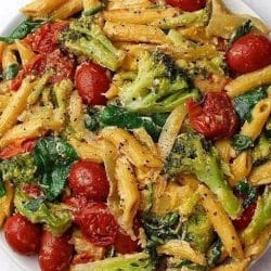 CHEESY PENNE WITH CHERRY TOMATOES, SPINACH AND BROCCOLI